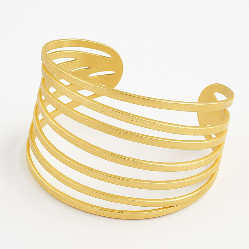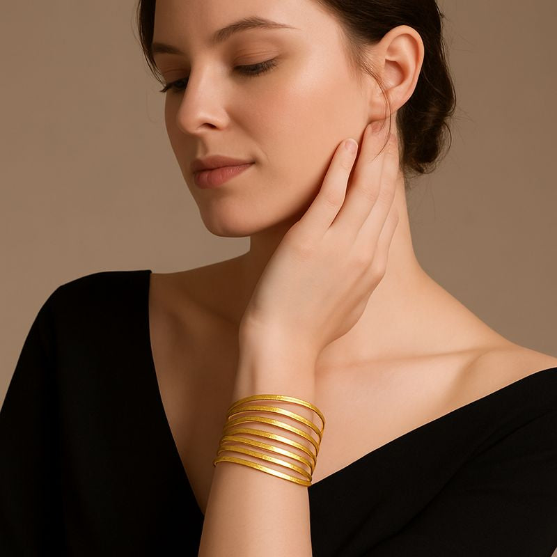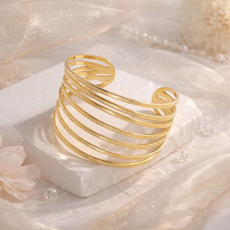 Uma peça que impõe presença com leveza. Myssac 7 Slaves Bracelet destaca-se pelo design de linhas paralelas, criando um efeito escultural e moderno que envolve o pulso com elegância natural. O acabamento dourado, subtilmente texturizado, reflete a luz de forma suave, tornando-a perfeita para quem procura um acessório sem excessos.